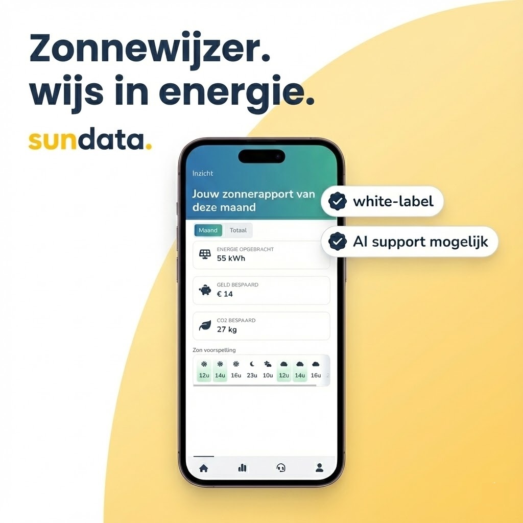 Zonnewijzer is een white-label app: in de huisstijl van de installateur of woningcorporatie. Bewoners zien dus niet “weer een nieuw portaal”, maar gewoon jullie eigen app. Dat helpt enorm om service netjes op één plek te houden.